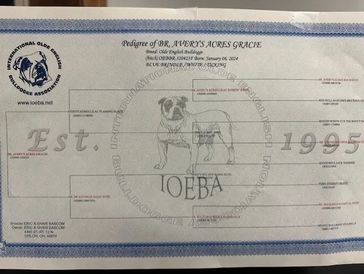 Blue Ribbon Avery’s Acres Blue Indigo is a stunning blue tri-colored registered Olde English Bulldogge with a heart as beautiful as her coat. Sister to Gracie, Indigo carries the same impressive champion bloodline, tracing back to her great-great-great-grandfather, the renowned What a Mug Ozzie Mad Russian. Her pedigree shines through in both her looks and her lively spirit.